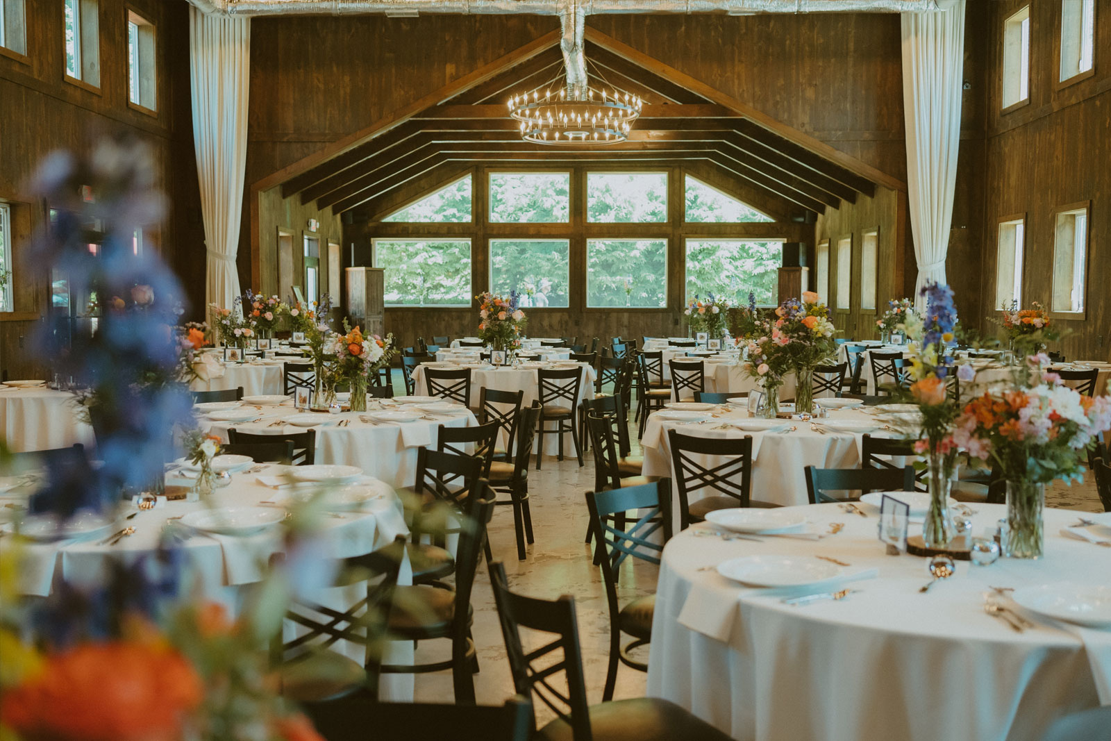 Nestled in the woods of Columbia Woodlands is The Wedding Pavilion Venue. The cathedral ceilings made of solid, stained wood paired with the ascending stone staircase makes for the perfect backdrop for any wedding photo. With the overhead wood roof, this venue is perfect for sunny weather as well as suited for the occasional pop-up shower. The venue can seat up to 175 accompanied with beautiful white chairs arranged to face the happy couple with ascending Dover mountains directly behind. The Wedding Pavilion is the perfect fit for summer, fall, and winter weddings.